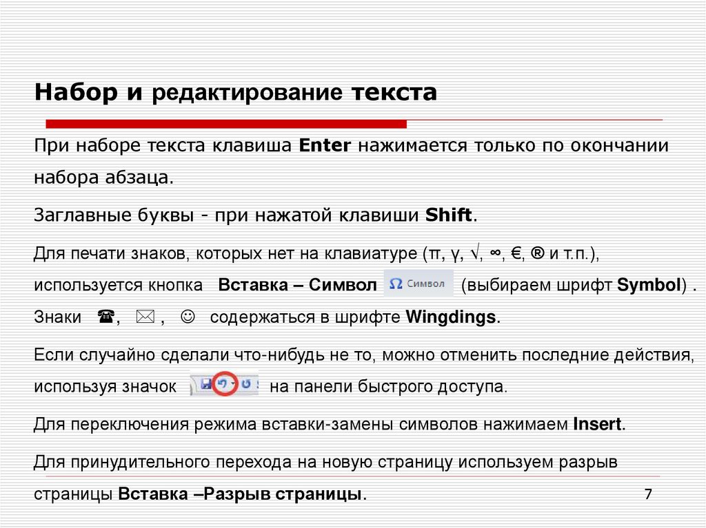 Набор и редактирование текстаПри наборе текста клавиша Enter нажимается только по окончании