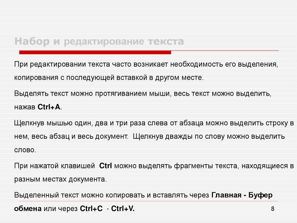 Набор и редактирование текстаПри редактировании текста часто возникает необходимость его выделения,