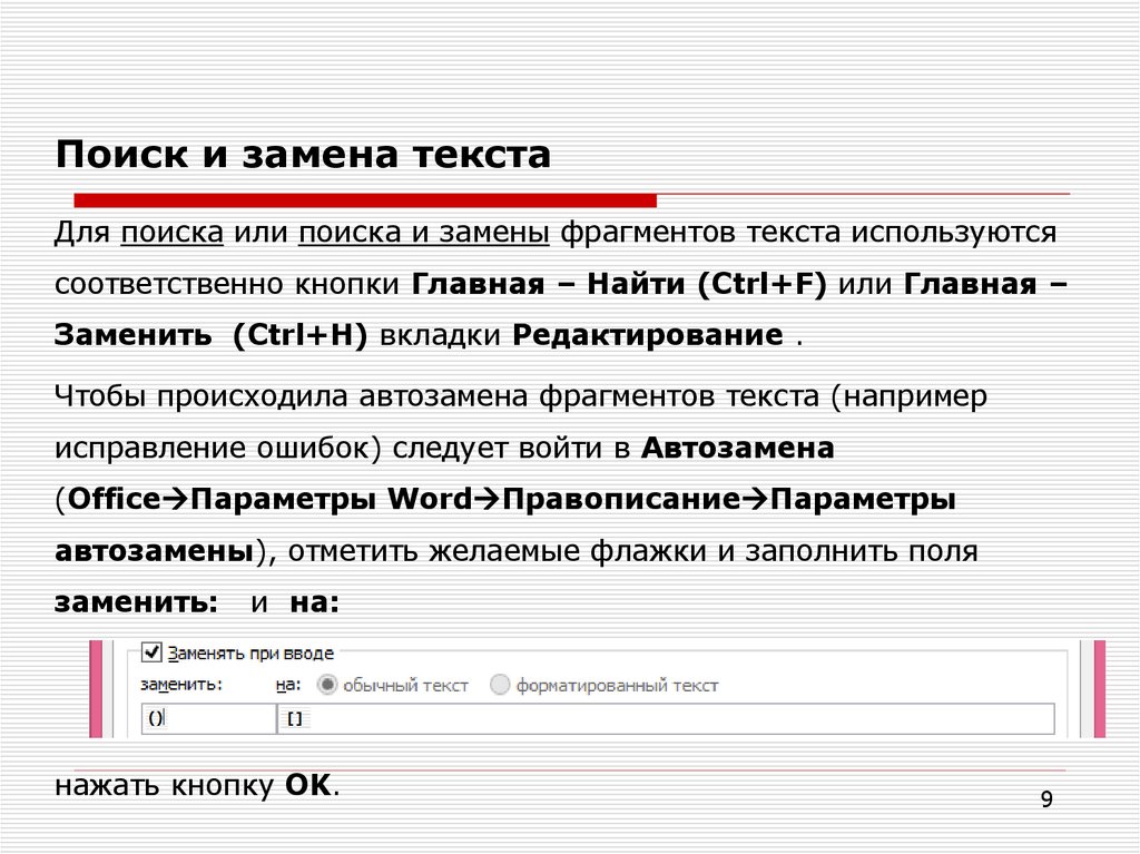 Поиск и замена текстаДля поиска или поиска и замены фрагментов текста используются