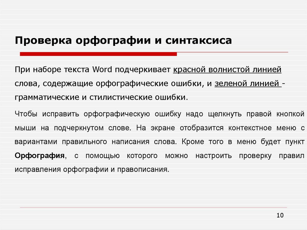 Проверка орфографии и синтаксисаПри наборе текста Word подчеркивает красной волнистой линией
