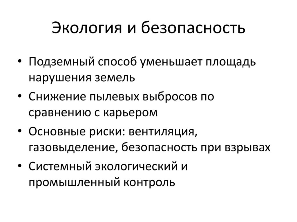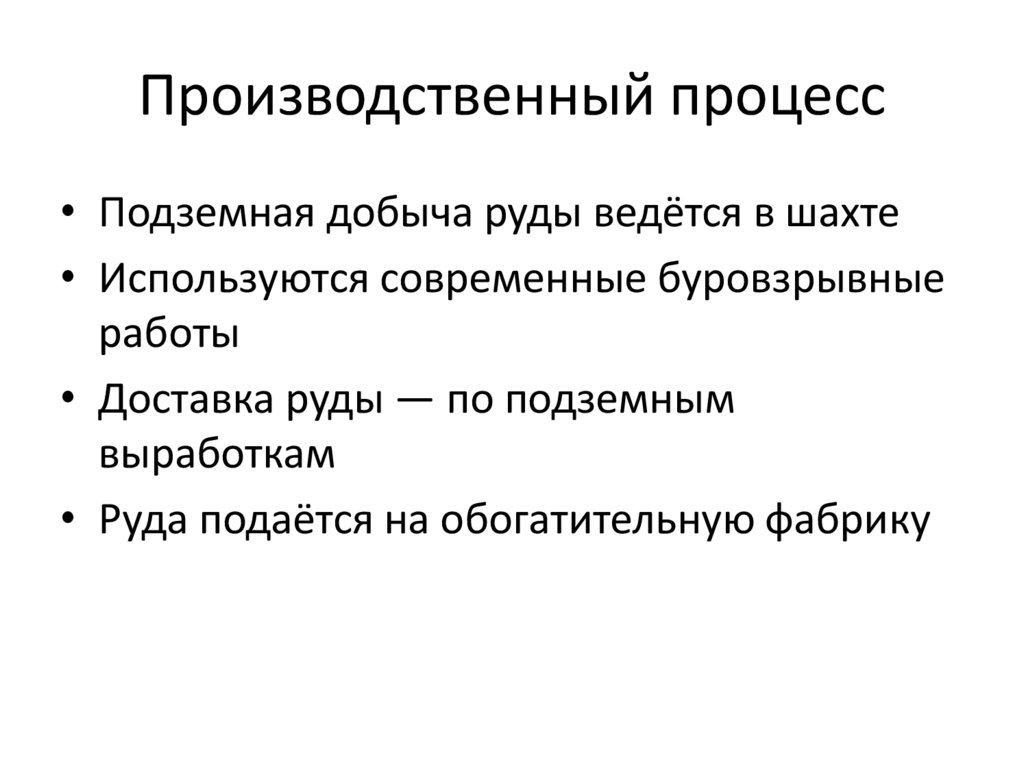 Производственный процесс• Подземная добыча руды ведётся в шахте