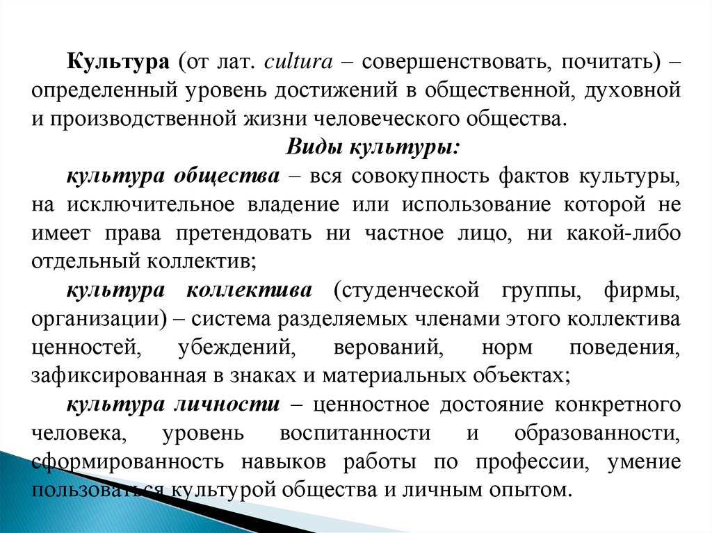 Культура (от лат. cultura ‒ совершенствовать, почитать) ‒определенный уровень достижений в общественной, духовной