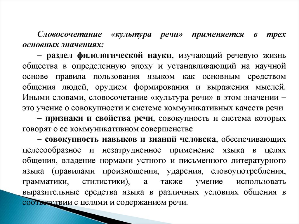 Словосочетание «культура речи» применяется в трехосновных значениях: