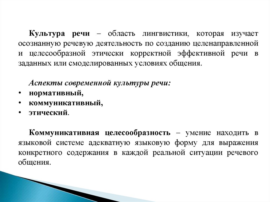 Культура речи ‒ область лингвистики, которая изучаетосознанную речевую деятельность по созданию целенаправленной