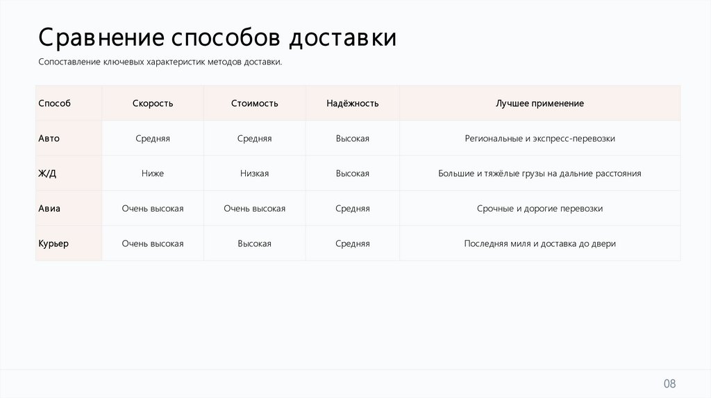 Сравнение способов достав киСопоставление ключевых характеристик методов доставки.