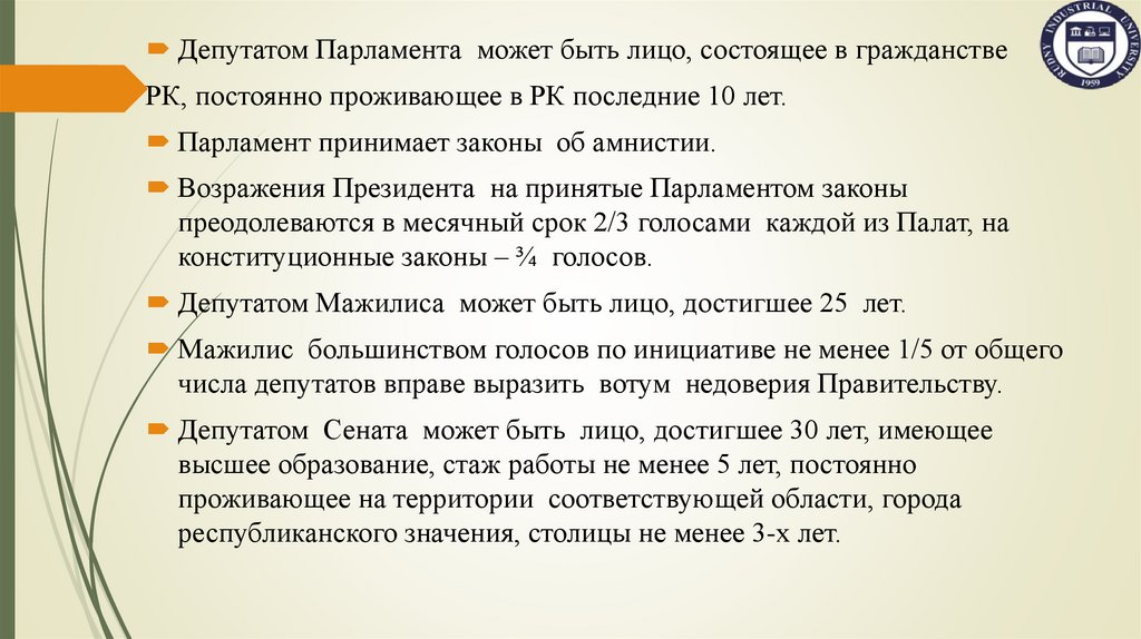 Депутатом Парламента может быть лицо, состоящее в гражданствеРК, постоянно проживающее в РК последние 10 лет.