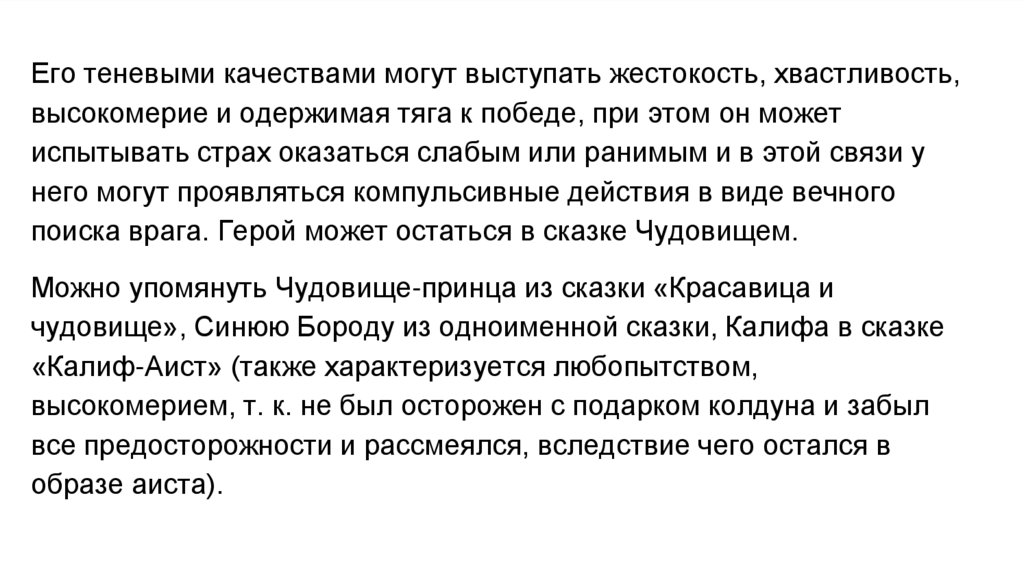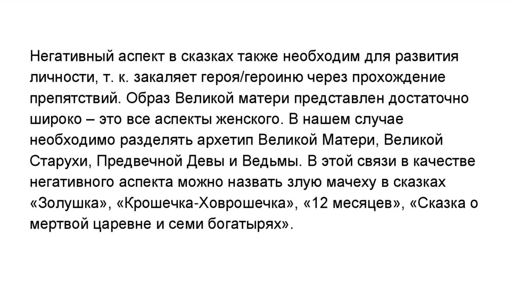 Негативный аспект в сказках также необходим для развитияличности, т. к. закаляет героя/героиню через прохождение