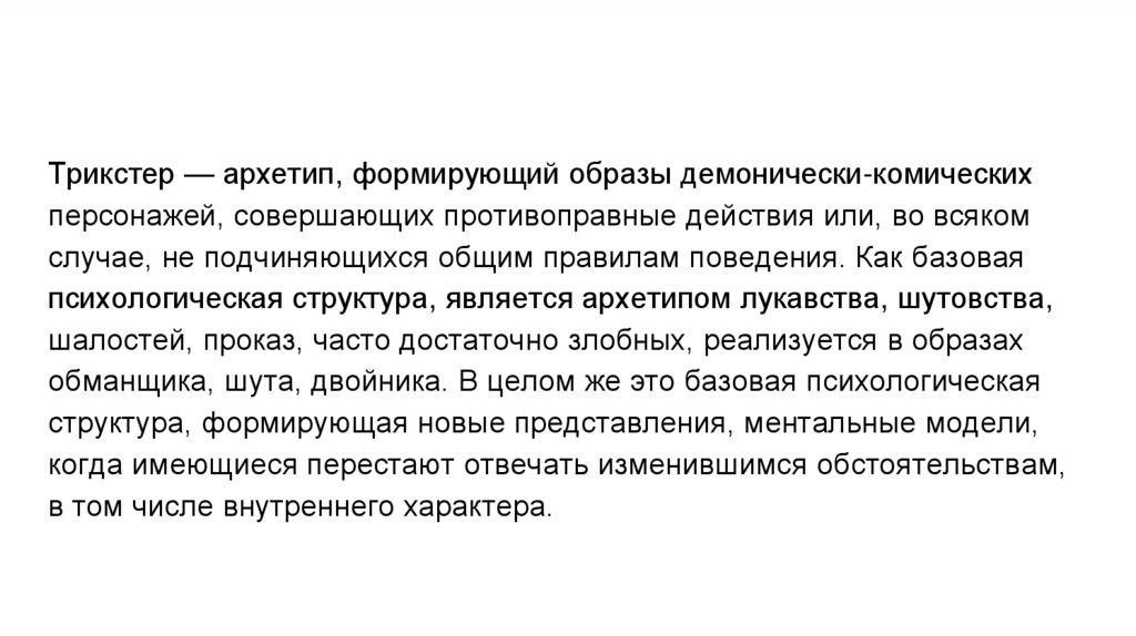 Трикстер — архетип, формирующий образы демонически-комическихперсонажей, совершающих противоправные действия или, во всяком