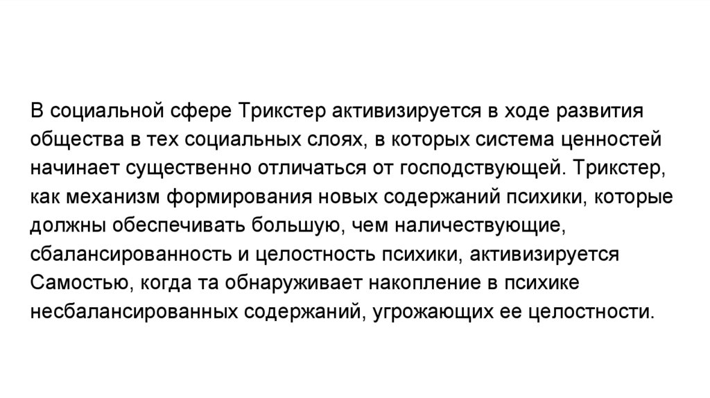 В социальной сфере Трикстер активизируется в ходе развитияобщества в тех социальных слоях, в которых система ценностей