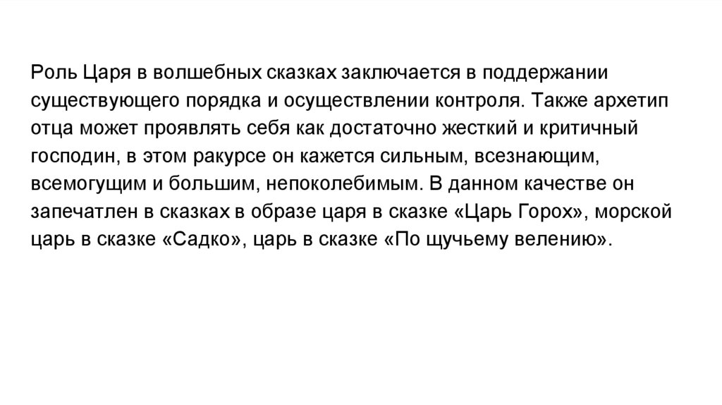 Роль Царя в волшебных сказках заключается в поддержаниисуществующего порядка и осуществлении контроля. Также архетип