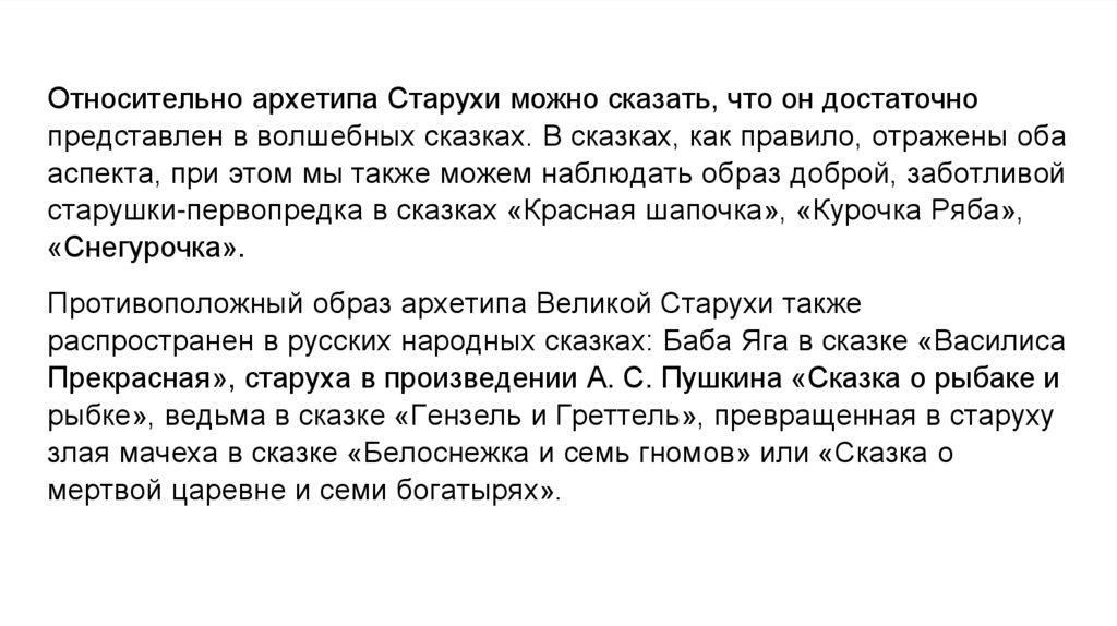 Относительно архетипа Старухи можно сказать, что он достаточнопредставлен в волшебных сказках. В сказках, как правило, отражены оба