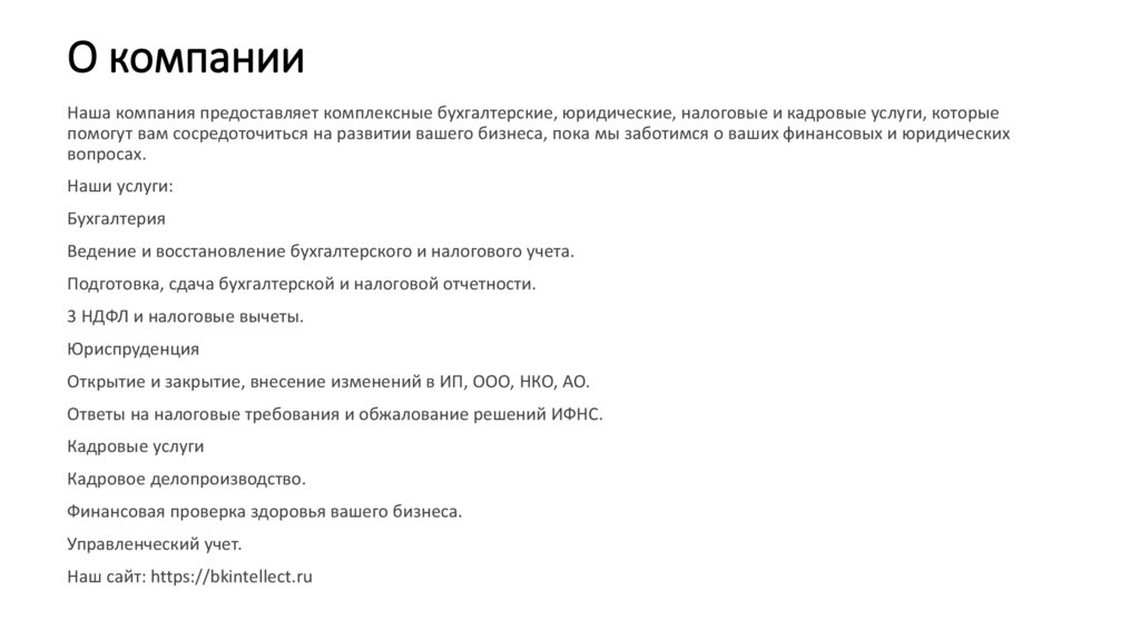 О компанииНаша компания предоставляет комплексные бухгалтерские, юридические, налоговые и кадровые услуги, которые