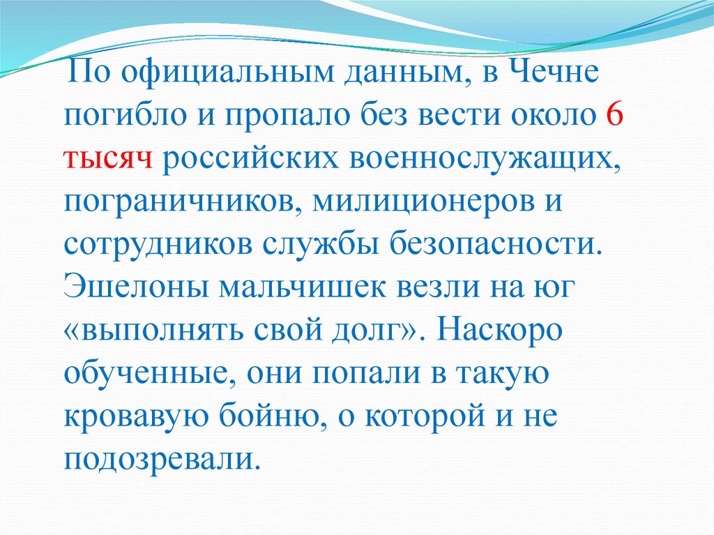 По официальным данным, в Чечнепогибло и пропало без вести около 6