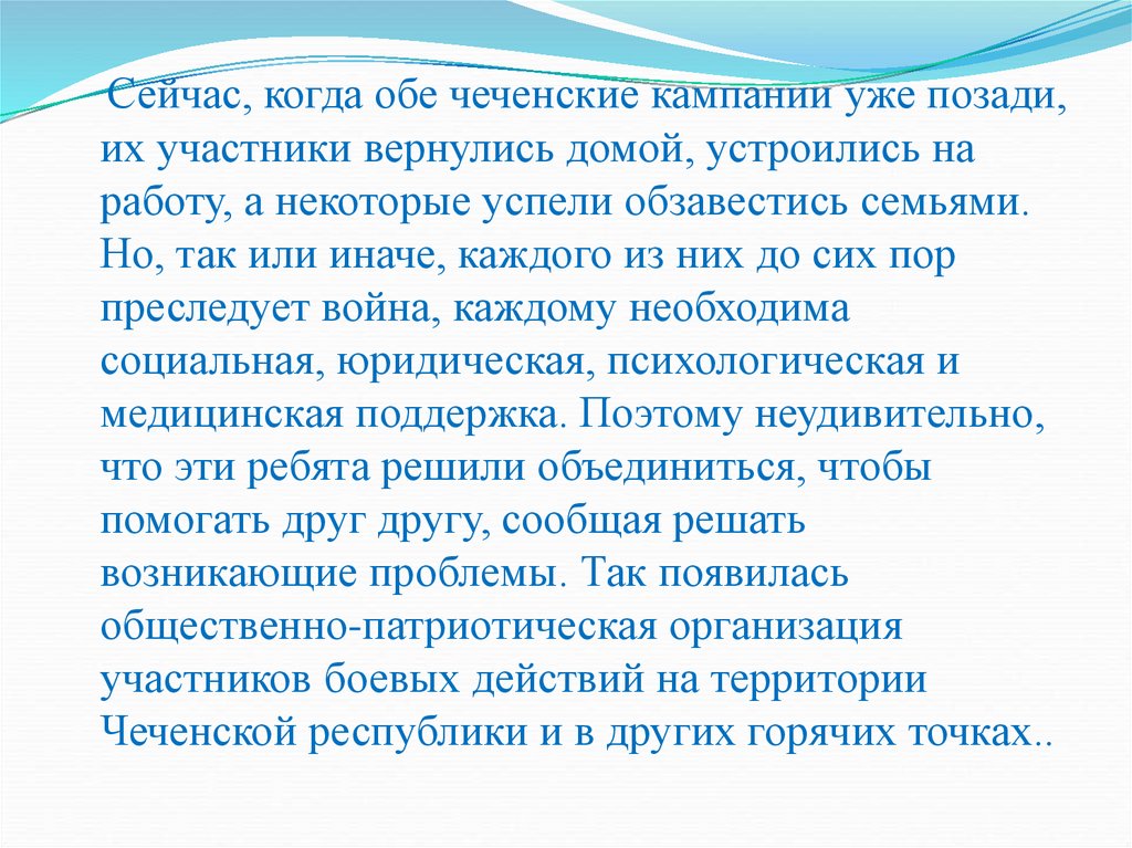 Сейчас, когда обе чеченские кампании уже позади,их участники вернулись домой, устроились на