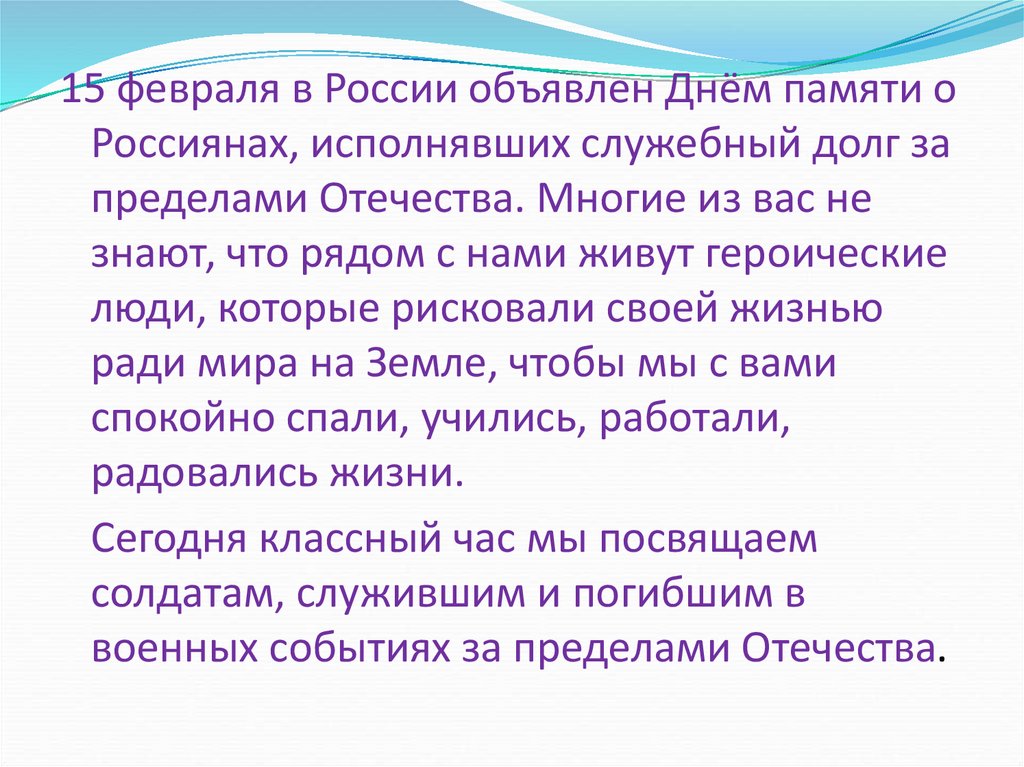 15 февраля в России объявлен Днём памяти оРоссиянах, исполнявших служебный долг за