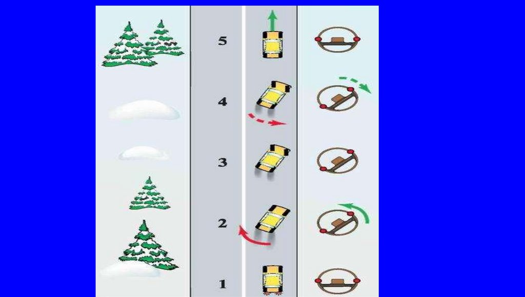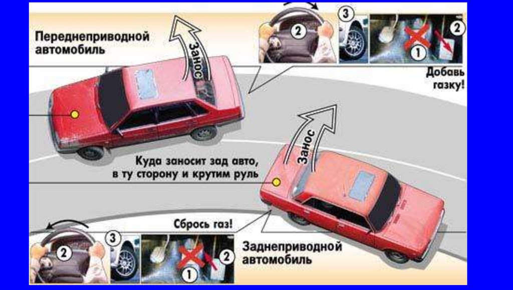 на скользкой дороге?Быстро, но плавно повернуть рулевое колесо в сторону заноса, затем