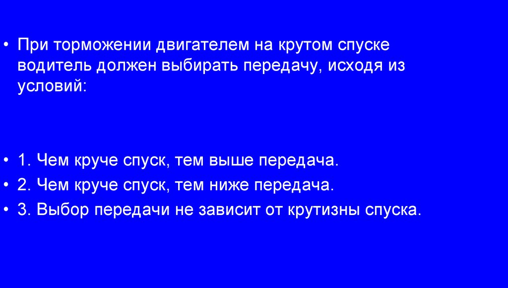 • При торможении двигателем на крутом спускеводитель должен выбирать передачу, исходя из