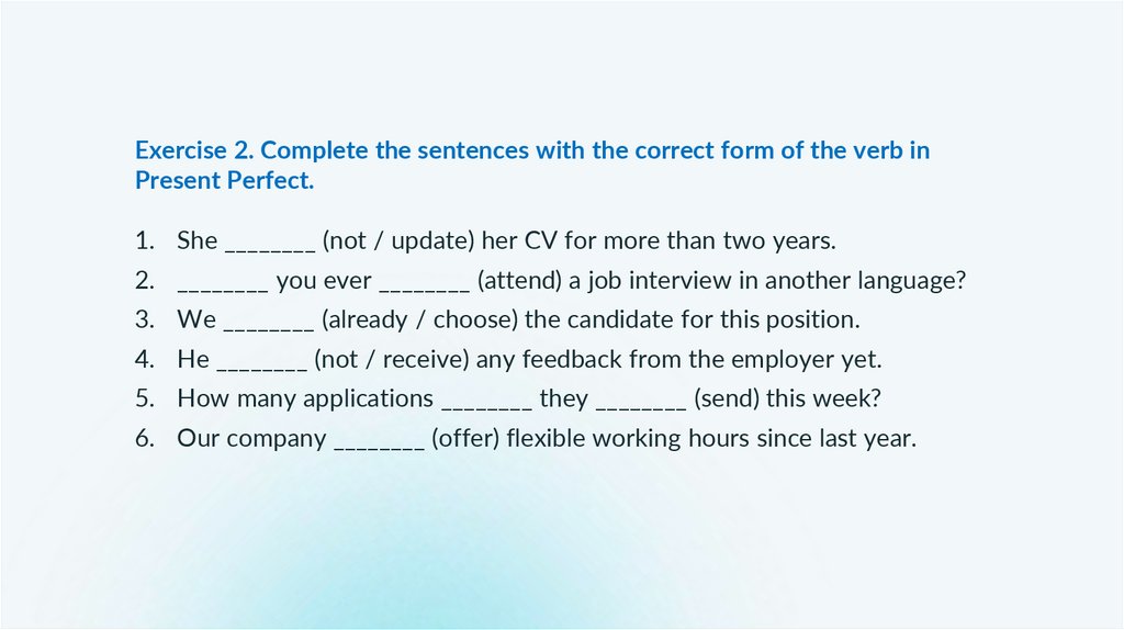 Exercise 2. Complete the sentences with the correct form of the verb inPresent Perfect.