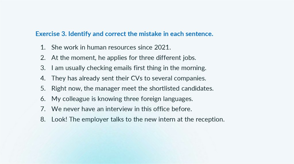 Exercise 3. Identify and correct the mistake in each sentence.1. She work in human resources since 2021.