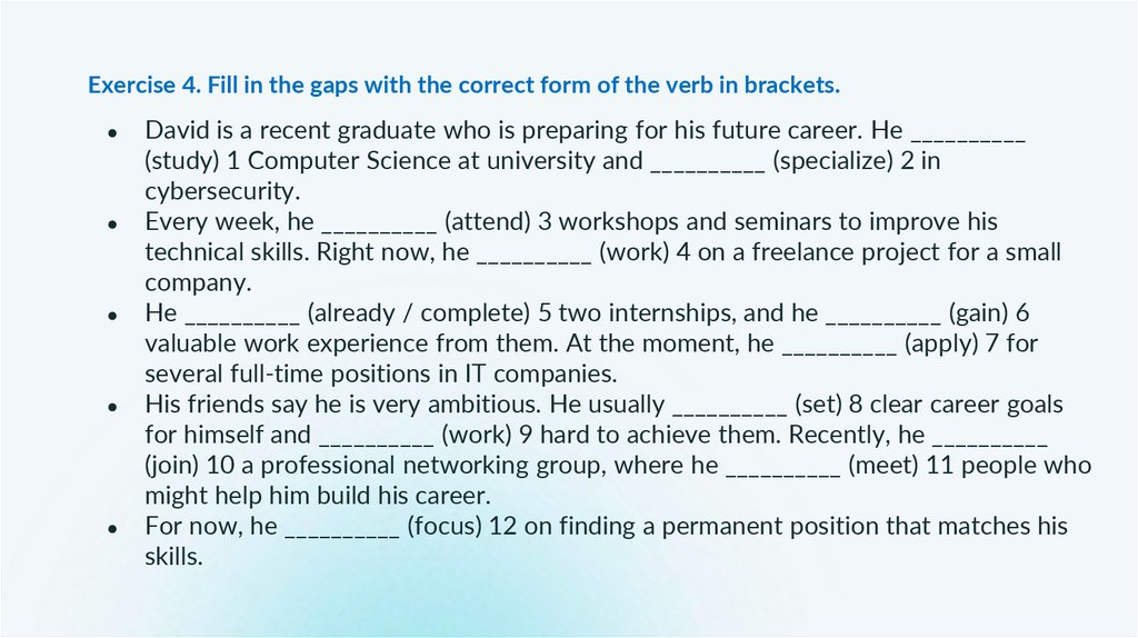 Exercise 4. Fill in the gaps with the correct form of the verb in brackets.David is a recent graduate who is preparing for his future career. He __________