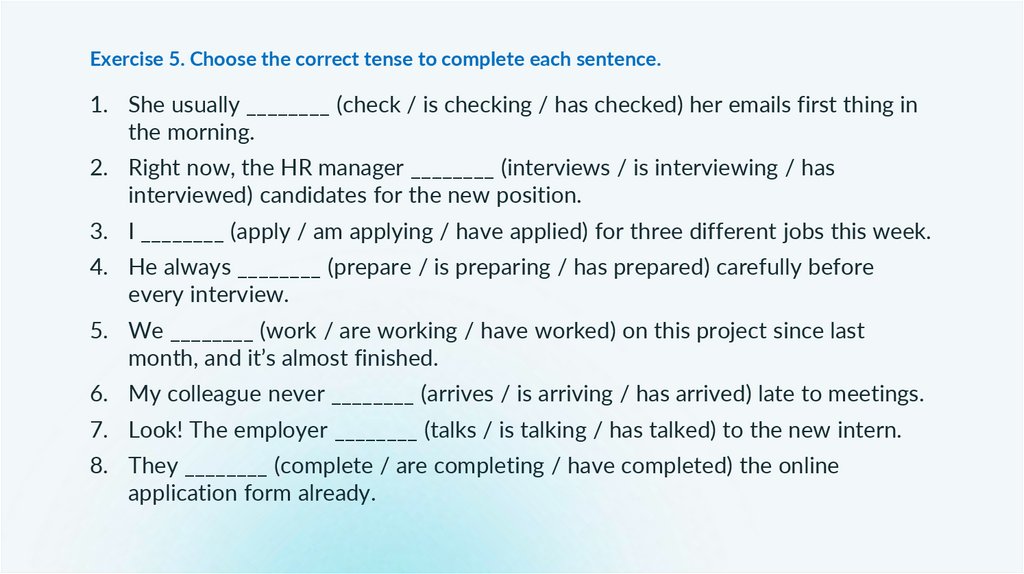 Exercise 5. Choose the correct tense to complete each sentence.1. She usually ________ (check / is checking / has checked) her emails first thing in