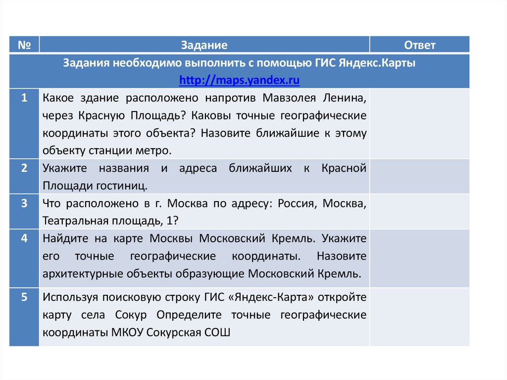 Задания необходимо выполнить с помощью ГИС Яндекс.Карты
