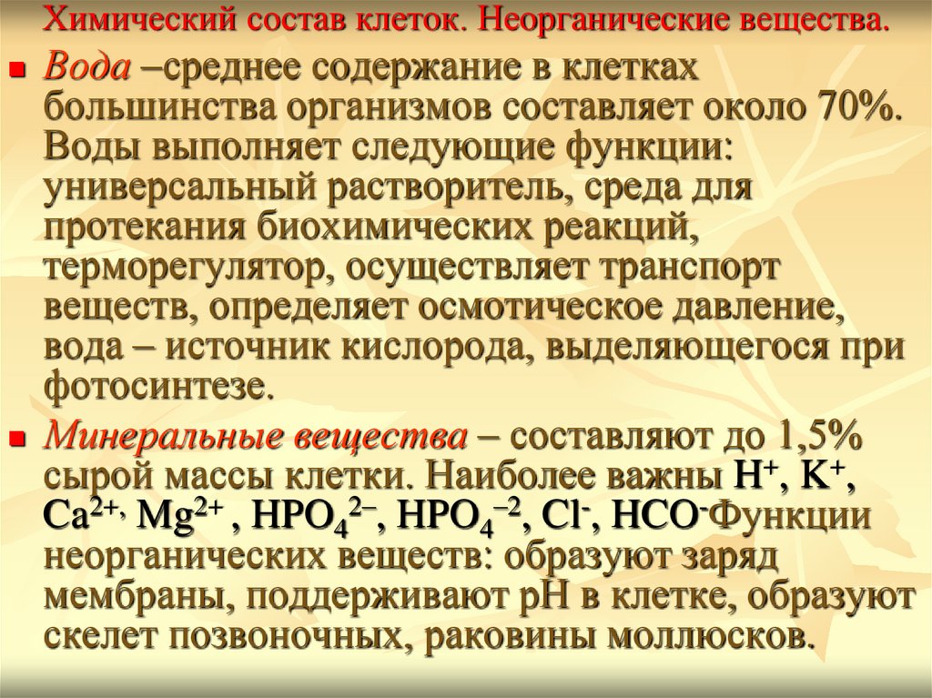 Химический состав клеток. Неорганические вещества.Вода –среднее содержание в клетках