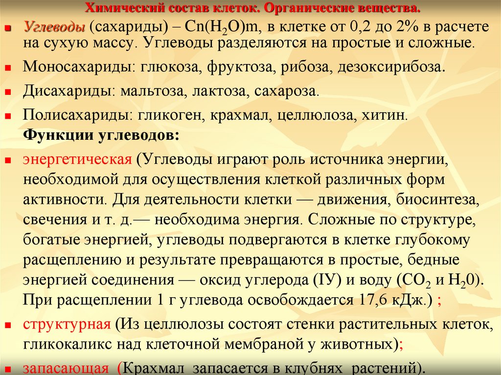 Химический состав клеток. Органические вещества.Углеводы (сахариды) – Cn(H2O)m, в клетке от 0,2 до 2% в расчете