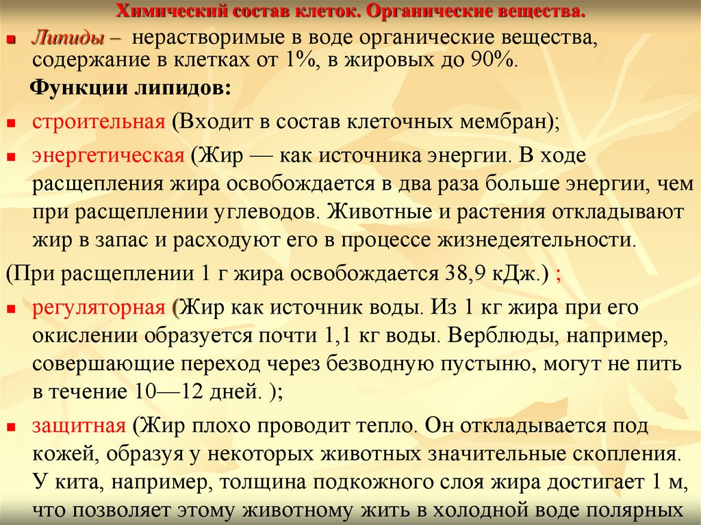 Химический состав клеток. Органические вещества.Липиды – нерастворимые в воде органические вещества,
