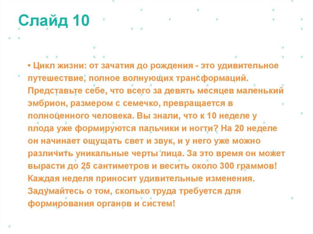 Слайд 10• Цикл жизни: от зачатия до рождения - это удивительное