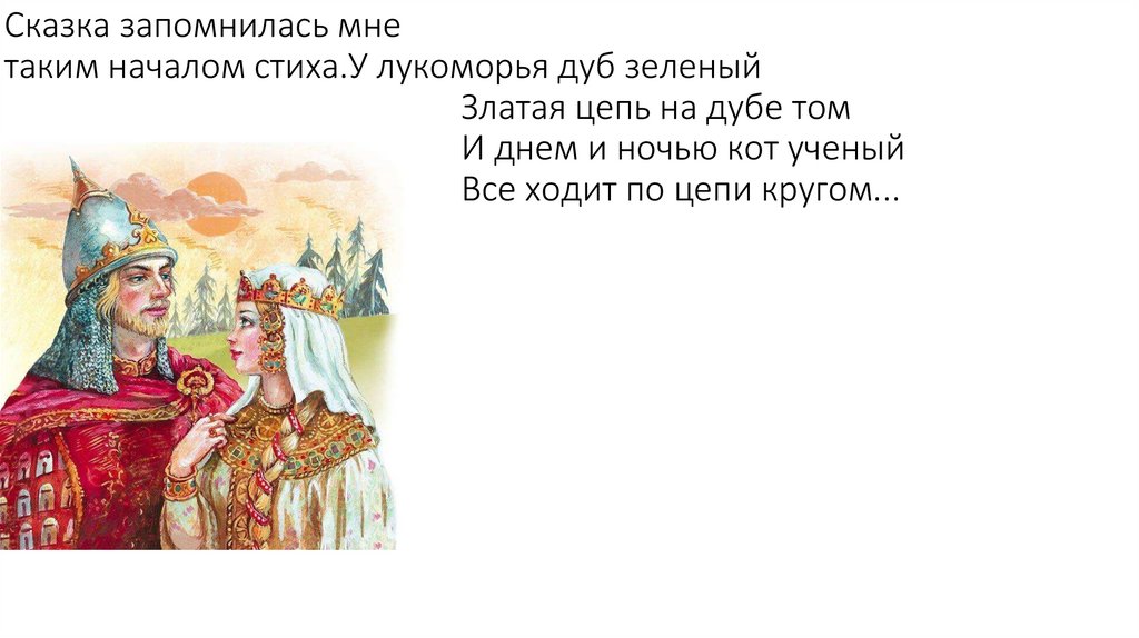 Сказка запомнилась мнетаким началом стиха.У лукоморья дуб зеленый