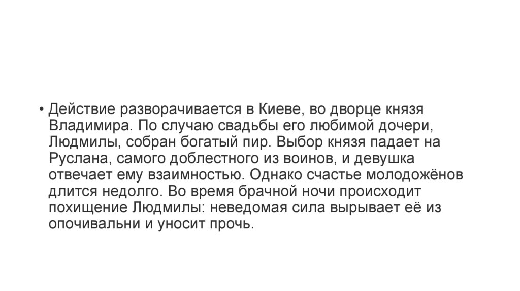• Действие разворачивается в Киеве, во дворце князяВладимира. По случаю свадьбы его любимой дочери,