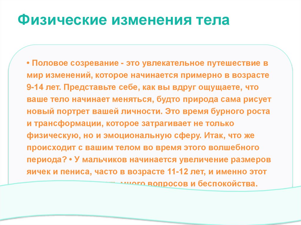 Физические изменения тела• Половое созревание - это увлекательное путешествие в
