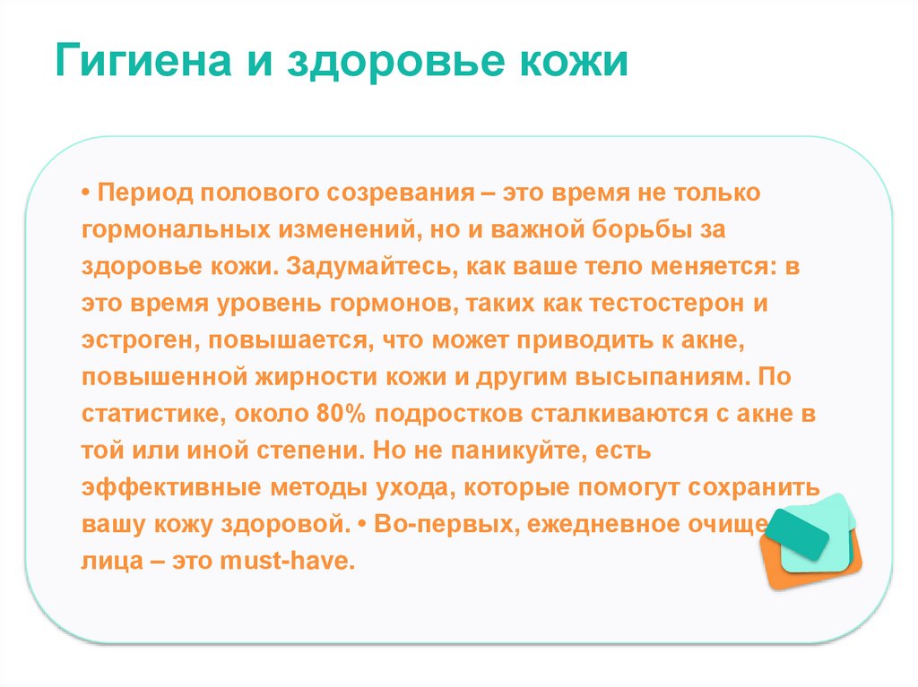 Гигиена и здоровье кожи• Период полового созревания – это время не только