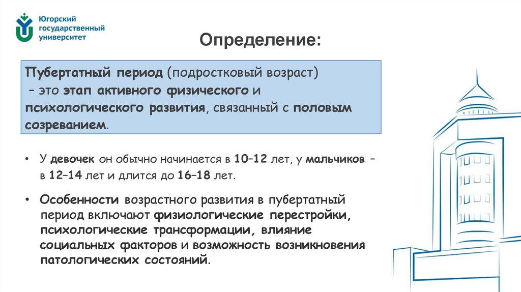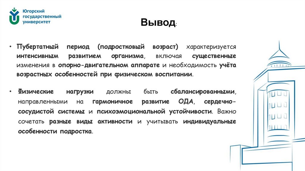 Вывод:• Пубертатный период (подростковый возраст) характеризуется