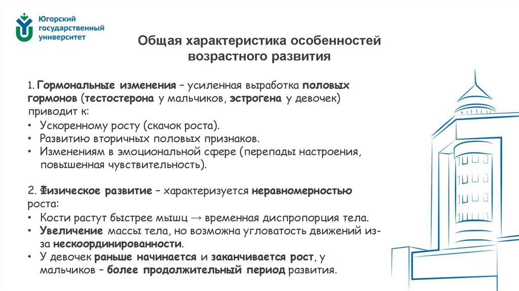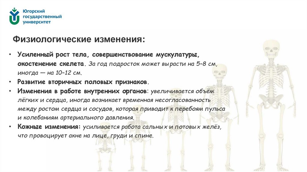 Физиологические изменения:• Усиленный рост тела, совершенствование мускулатуры,