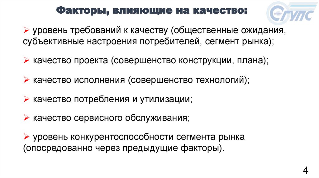 Факторы, влияющие на качество:уровень требований к качеству (общественные ожидания,