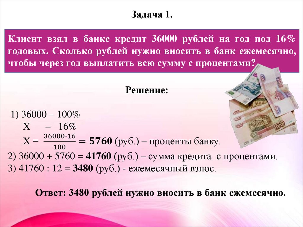 Задача 1.Клиент взял в банке кредит 36000 рублей на год под 16%