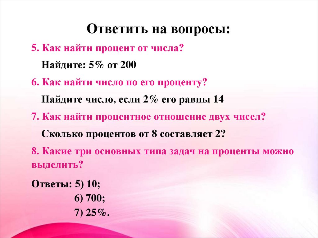 1. Что называется процентом?2. Как перевести проценты в десятичную дробь?