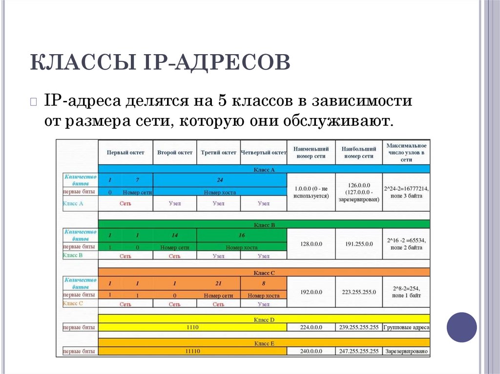 КЛАССЫ IP-АДРЕСОВIP-адреса делятся на 5 классов в зависимости