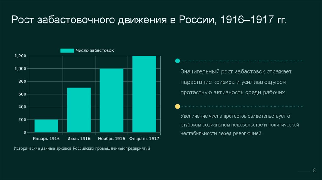 Рост забастовочного движения в России, 1916–1917 гг.Значительный рост забастовок отражает