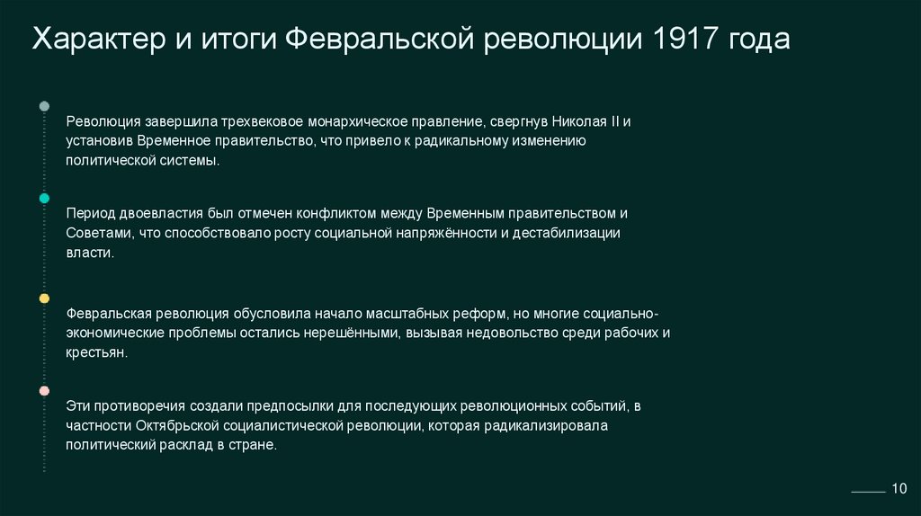 Характер и итоги Февральской революции 1917 годаРеволюция завершила трехвековое монархическое правление, свергнув Николая II и