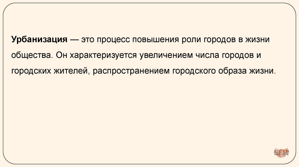 Урбанизация — это процесс повышения роли городов в жизниобщества. Он характеризуется увеличением числа городов и