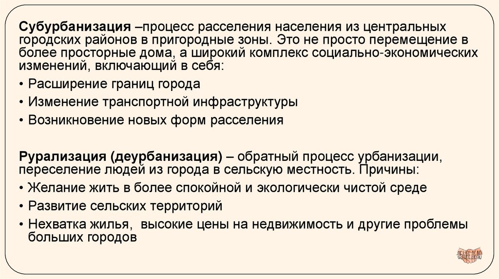Рурализация (деурбанизация) – обратный процесс урбанизации,