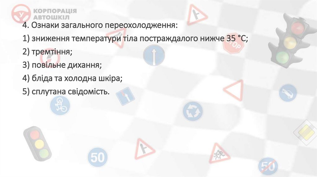 4. Ознаки загального переохолодження:1) зниження температури тіла постраждалого нижче 35 °C;