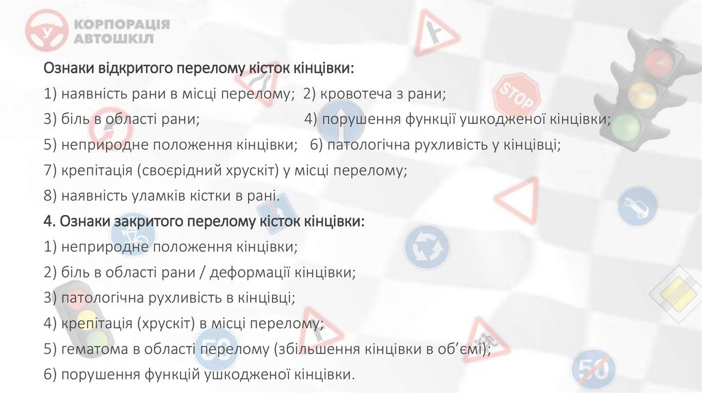 5) неприродне положення кінцівки; 6) патологічна рухливість у кінцівці;