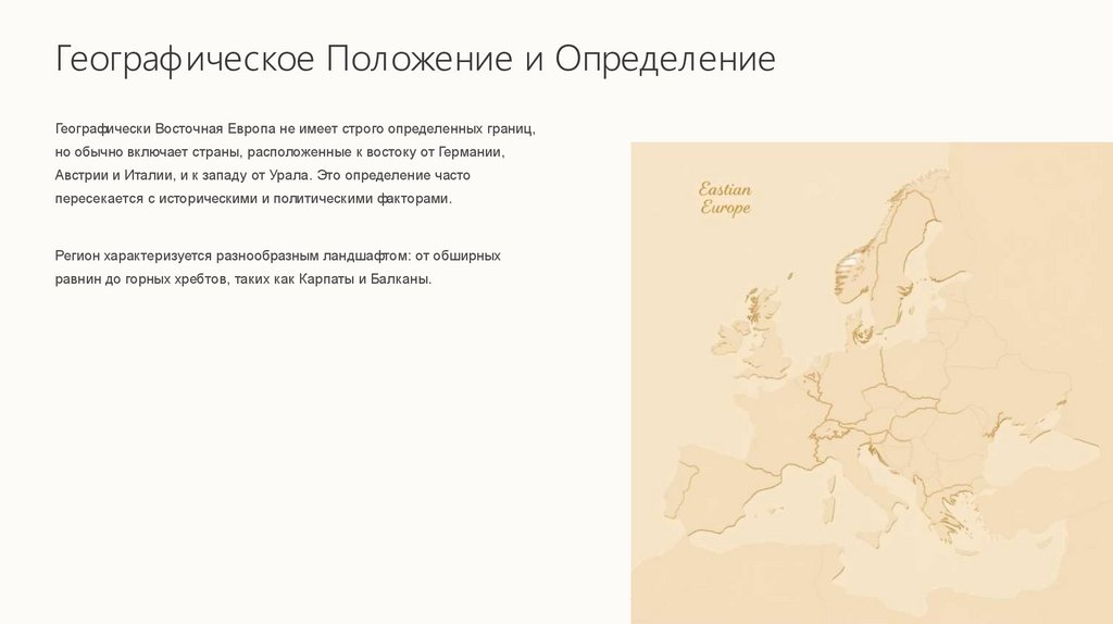 Географическое Положение и ОпределениеГеографически Восточная Европа не имеет строго определенных границ,