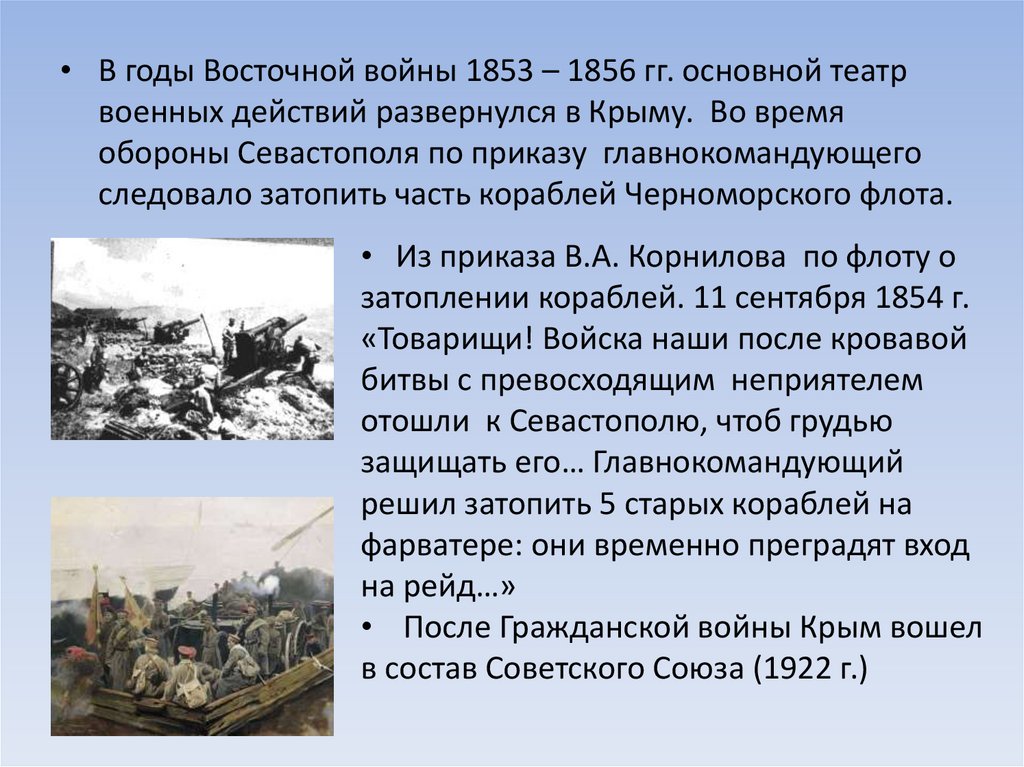 • В годы Восточной войны 1853 – 1856 гг. основной театрвоенных действий развернулся в Крыму. Во время