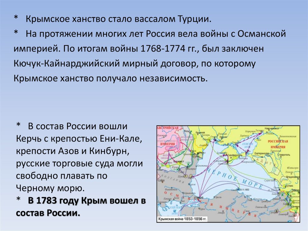 * Крымское ханство стало вассалом Турции.* На протяжении многих лет Россия вела войны с Османской