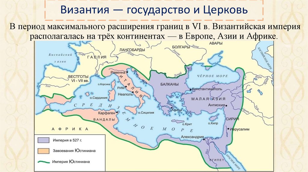 Византия — государство и ЦерковьВ период максимального расширения границ в VI в. Византийская империя